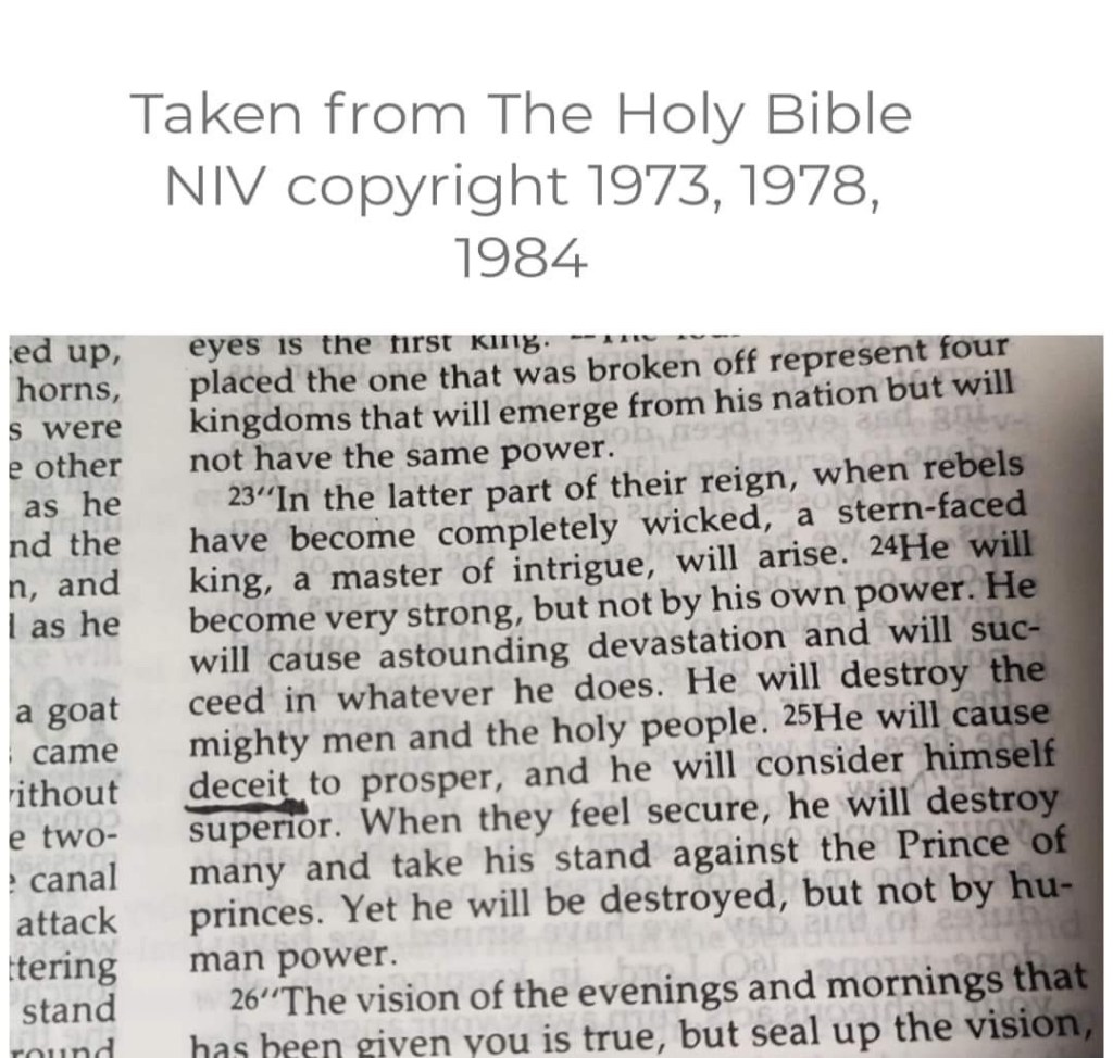 —“And through his policy also he shall cause craft to prosper in his hand; and he shall magnify himself in his heart, and by peace shall destroy many: he shall also stand up against the Prince of princes; but he shall be broken without hand.” Daniel 8:25 KJV. https://www.bible.com/bible/1/dan.8.25.kjv. ( 1. through his cunning was changed to through his policy. 2. Cause deceit was changed to cause craft) . This is so much of mockery of the Scripture changing “ deceit” to “ craft” word as synonym to ‘ witchcraft’ .