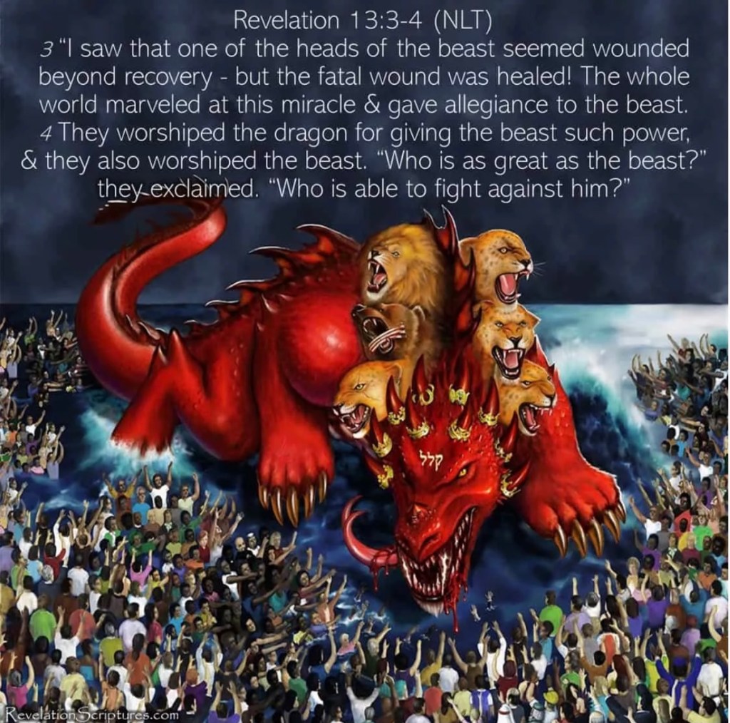 “Then I saw a second beast, coming out of the earth. It had two horns like a lamb, but it spoke like a dragon. It exercised all the authority of the first beast on its behalf, and made the earth and its inhabitants worship the first beast, whose fatal wound had been healed.” Revelation 13:11-12 NIV https://revelation.bible/revelation-13-12