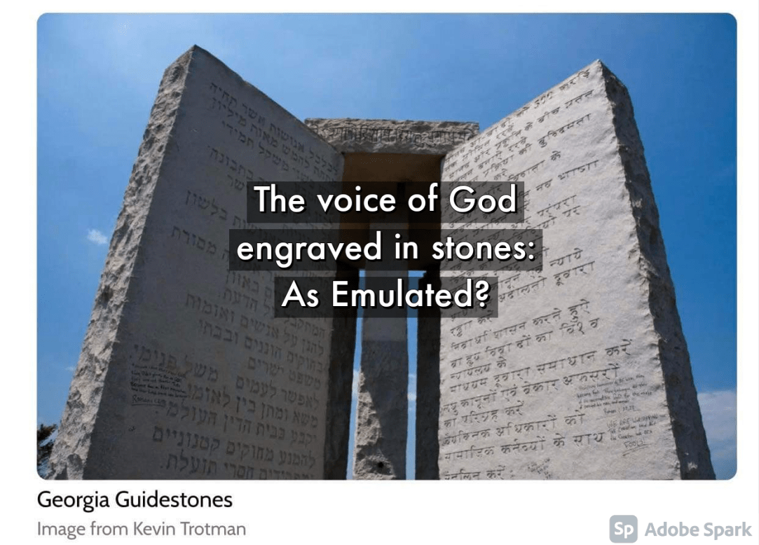 Emulation is to strive to equal or excel there’s an effort to match or surpass a person or an achievement, typically by imitation. The world in the course of time evolved hugely in all efforts to excel in life either for self gain or in power control. Many ways man made to emulate what God has done to pull man away from the truths of God. One structure that resembles with the engraving of messages in stone is the Georgia Guide Stones.