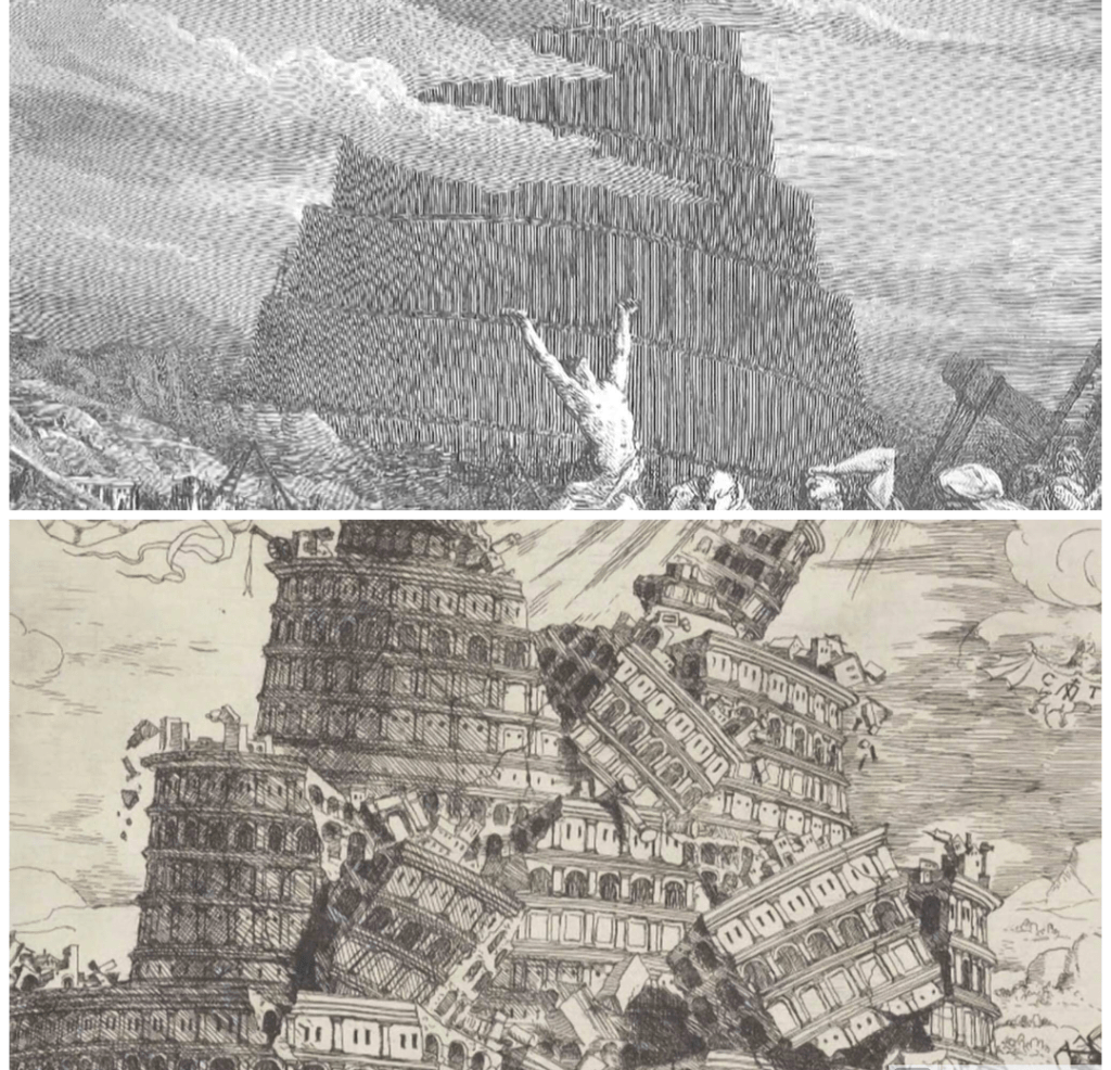 “And they said, Come, let us build us a city, and a tower, whose top may reach unto heaven, and let us make us a name; lest we be scattered abroad upon the face of the whole earth. And Jehovah came down to see the city and the tower, which the children of men builded. And Jehovah said, Behold, they are one people, and they have all one language; and this is what they begin to do: and now nothing will be withholden from them, which they purpose to do. Come, let us go down, and there confound their language, that they may not understand one another’s speech. So Jehovah scattered them abroad from thence upon the face of all the earth: and they left off building the city. Therefore was the name of it called Babel; because Jehovah did there confound the language of all the earth: and from thence did Jehovah scatter them abroad upon the face of all the earth.” Genesis 11:4-9