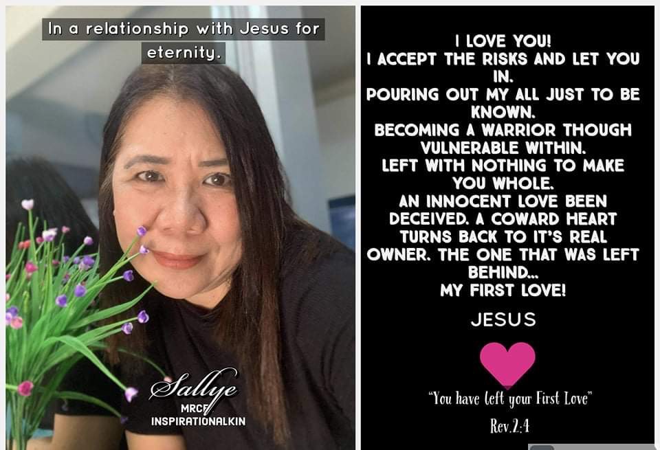 I was born and raised in a Christian home, I’m truly blessed by the faith legacy our parents had passed on to us. I have grown and known the church all because of JESUS. I consider Him as my “FIRST LOVE” at the age of seven, I let Him entered my heart. That relationship grows, and at younger age I long to constantly read His love letters the “Bible”, and listen to stories about Him. In my eighteen years, I committed my life to the call to follow Him. His love flows abundantly as I share this personal Savior relationship to others. Until the gods of this world keep knocking in the door of my heart. Offering trickery love that made me open my heart to enter in. Since then I became like the church in Ephesus: I’m not LOSING MY FIRST LOVE BUT I’m LEAVING MY FIRST LOVE. Slowly in a way I never expected and perceived because I’m still within the church, in ministry and service. The ignition of that love to Jesus was not the same anymore. Trapped and marred by the deceiving manipulations of satan in this world.