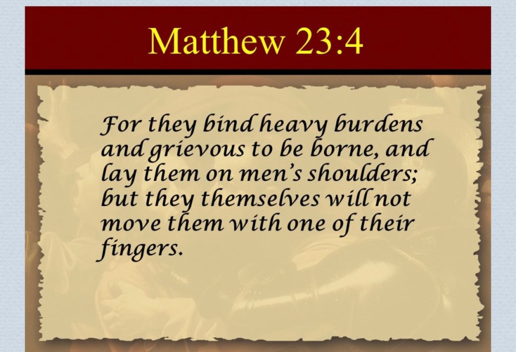 1. “Woe to you, teachers of the law and Pharisees, you hypocrites! You shut the door of the kingdom of heaven in people’s faces. You yourselves do not enter, nor will you let those enter who are trying to.”Matthew 23:13 NIV. 14 “Woe to you, scribes and Pharisees, hypocrites! for you devour widows’ houses, and for a pretense make long prayer: therefore you shall receive the greater damnation.”