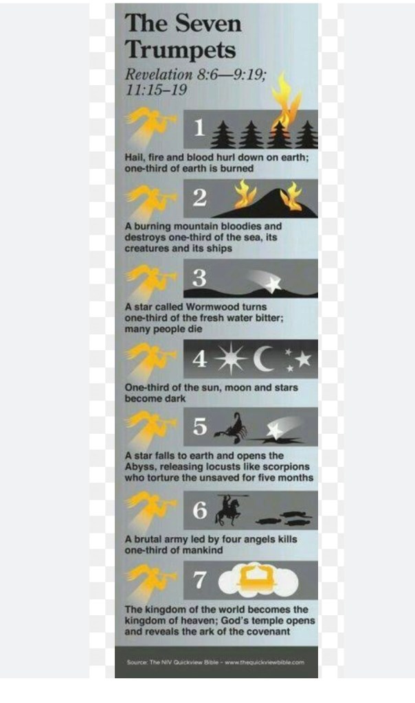 As the 5TH TRUMPET sounds the bottomless pit was opened and abaddon is released and a hoard of demons locusts hybrid type creatures ascend. From the bottomless pit to torment the world for 5 months. The 6TH TRUMPET sounds, the four fallen angels who were bound in deep waters are released to prepare an army of 2hundred million horsemen and through their war a third of the remaining population on earth end up dying. This interlude between the 6th trumpet and to the 7th trumpet judgement which cover the entire second half of the tribulation. During this interlude the antichrist declare himself as god and completed the “mark of the beast” his demonic reign . The 7th trumpet is the start of Christ’s 1000 year reign. It is the time believers get the answer to their prayers: Matthew 6:10 “let your kingdom come Your will be done on earth as it is in heaven.”